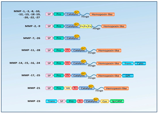 MMPs are multi-domain enzymes composed of at least one catalytic domain and a prodomain (except for MMP-23). In addition, the most common components of MMPs are the hemopexin domain and the region connecting it to the catalytic domain [5,11,18,19].