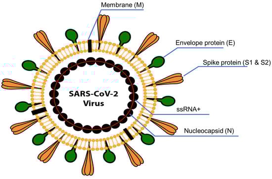 Schematic structure of SARS-CoV-2. The viral structure is primarily formed by the structural spike (S) proteins, envelope (E), membrane (M), and nucleocapsid (N) proteins. The S, M, and E proteins are all embedded in the viral envelope, a lipid bilayer derived from the host cell membrane. The N protein interacts with the viral RNA in the core of the virion.