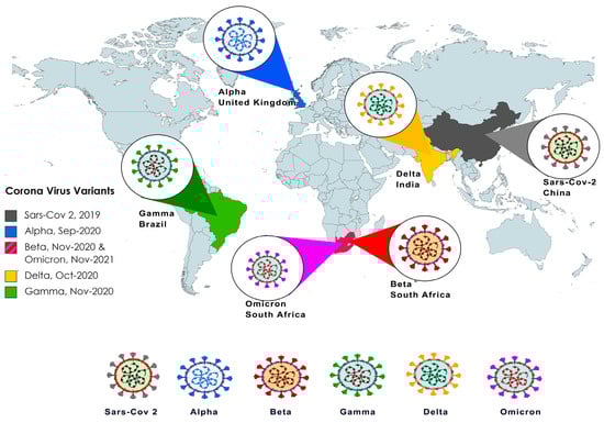 Similar to other coronaviruses, SARS-CoV-2 has a high evolutionary rate, of approximately 1.1 × 10−3 substitutions per site/year [35]. Since its earlier detection in Wuhan, China, in late 2019, SARS-CoV-2 has undergone many mutations. On 10 January 2020, the first SARS-CoV-2 genome was sequenced and published online. After 13 months, 468,000 sequences of the virus were published [36]. Different SARS-CoV-2 variants have appeared and are driven by a broad spectrum of recombination, point mutations, deletions, and amino acid substitutions, particularly in the S protein RBD of SARS-CoV-2. The World Health Organization (WHO) has classified the SARS-CoV-2 variants into three main categories, such as the variants of concern (VOCs), variants of interest (VOIs), and variants under monitoring (VUMs) [35]. So far, the five reported VOCs include the Alpha (B.1.1.7), Beta (B.1.351), Gamma (P.1), Delta (B.1.617.2), and Omicron (B.1.1.529) variants (Figure 2). VOCs are associated with at least one of the following changes: increased transmissibility; increased virulence; change in clinical disease presentation; or decrease in the effectiveness of public health and social measures, such as available diagnostics, vaccines, or therapeutics [37].