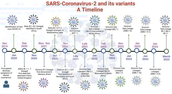 Timeline of different VOCs of SARS-CoV2. More than 17 different variants have been discovered starting from its origin in 2019 through the most recent VOC discovered early in 2023.