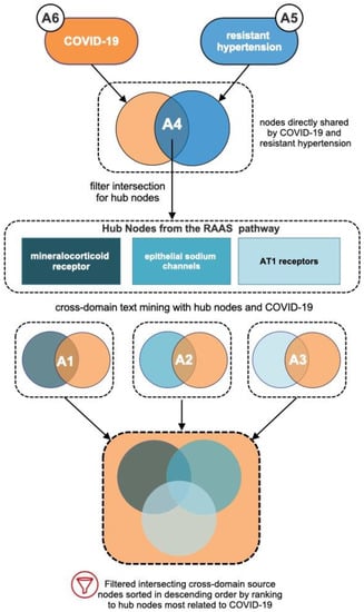 | A4 | Intersection of high-ranking A5 and A6 source nodes to determine hub nodes for cross-domain analysis in A1, A2, A3 | COVID-19 (C5203670); resistant hypertension (C0745130) |