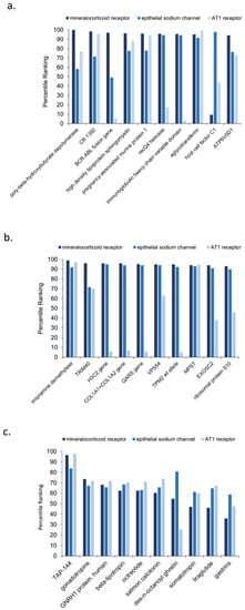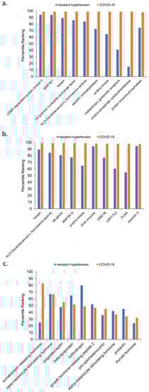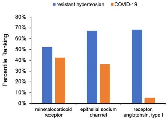 - BCR-ABL fusion gene—Within the list of highest percentile-ranked amino acids and proteins in Figure 6a, the BCR-ABL fusion gene possesses a percentile ranking for mineralocorticoid receptors that is nearly 50% higher than the next greatest percentile ranking for the source nodes of interest. While most clinicians associate the presence of BCR-ABL fusion gene with chronic myeloid leukemia (CML), about 10% of healthy control patients express at least some measurable copies in their peripheral blood [97]. Prior work relating COVID-19 to CML concisely summarizes the role of the gene in upregulating fusion transcripts and proteins, ultimately intensifying the presence and activity of tyrosine kinase within the body [98]. Recent extensive investigation of tyrosine kinase has revealed its direct association in vasculopathy as well as its antihypertensive properties from its interactions with endothelial receptors [99]. Such findings could explain the well-predicted increase in cardiovascular adverse events, including hypertension, in CML patients on tyrosine kinase inhibitor therapies [22]. Since protein kinase in integral in the signaling process of mineralocorticoid receptors both on and within the nucleus of endothelial cells [100], it can be hypothesized that COVID-19 provokes resistant hypertensive tendencies partially by manipulating the expression of BCR-ABL in the mineralocorticoid receptor pathway, decreasing the activity of tyrosine kinase [100].