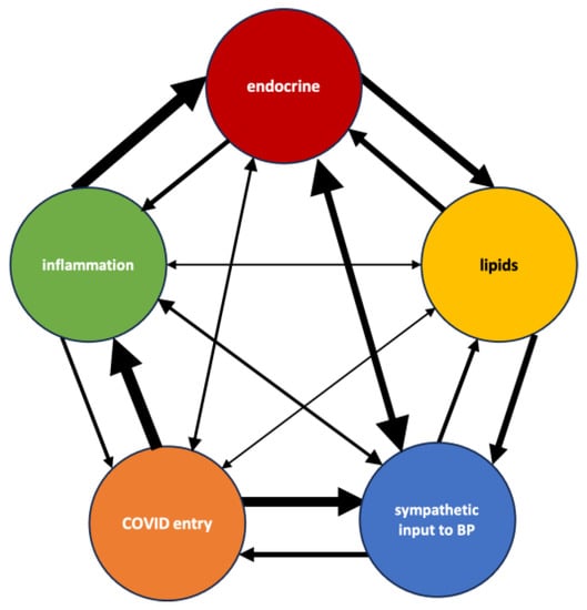 - gastrins—Hypertension is related to impaired metabolic homeostasis and can be regarded as a metabolic disorder [154]. Interestingly, an in silico modeling study examining molecular dynamics suggested that pentagastrin, a synthetic polypeptide that has effects like gastrin when given parenterally, could be a viable drug for COVID-19 [155]. Gastrin-releasing peptide has long been held for its possible role as a target for inflammatory disease [156], including cardiovascular disease, gastrointestinal disease, pulmonary disease, and of course, its roles in endocrine disorders, namely glucose metabolism.