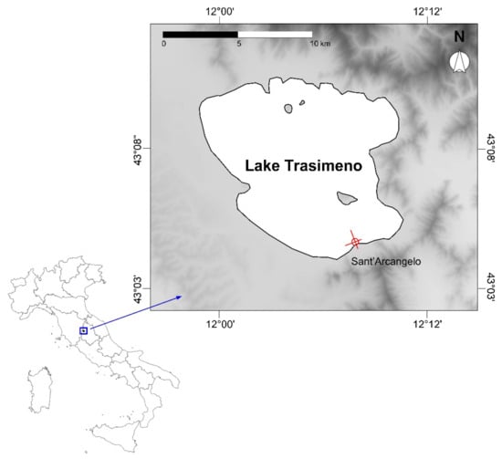 This study was performed in Lake Trasimeno (43.133283° N, 12.100064° E, central Italy; Figure 1). The basin is the largest laminar lake in Italy (124 km2, average depth: 4.7 m, maximum depth: 6.3 m). It is located 257 m above sea level, it has a single artificial effluent, and it is fed by several ephemeral creeks. Given the relatively small extension of the watershed (396 km2), its hydrological regime is driven by precipitation, and strong seasonal and interannual oscillations in water level and chemistry are observed [,]. Further details on the lake’s morphometric and hydrological characteristics are provided in Ludovisi and Gaino [] and in Bresciani et al. [].