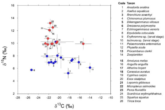 δ13C and δ15N values (Mean ± 1 SD) of consumers (invertebrates: codes 1–14; fish: codes 15–26; blue and red circles, respectively) characterizing the food web of Lake Trasimeno in winter. Non-indigenous species are indicated in bold.