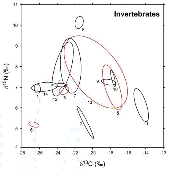 Sample-size-corrected Bayesian standard ellipse areas (SEAc) calculated from δ13C and δ15N values of invertebrate consumers. Black and red ellipses refer to native and non-indigenous taxa, respectively; see Figure 2 for the corresponding identification codes.
