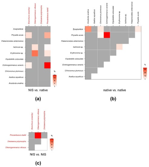 Percent isotopic niche overlaps of Bayesian standard ellipse areas (SEAB) of non-indigenous vs. native (a), native vs. native (b), and non-indigenous vs. non-indigenous invertebrate consumers (c). Heat maps were built using modal overlaps; the reader should refer to Table A4, Table A5 and Table A6 in Appendix C for 95% confidence intervals of modal values and the corresponding SEAc estimations. Please note the different % scales.