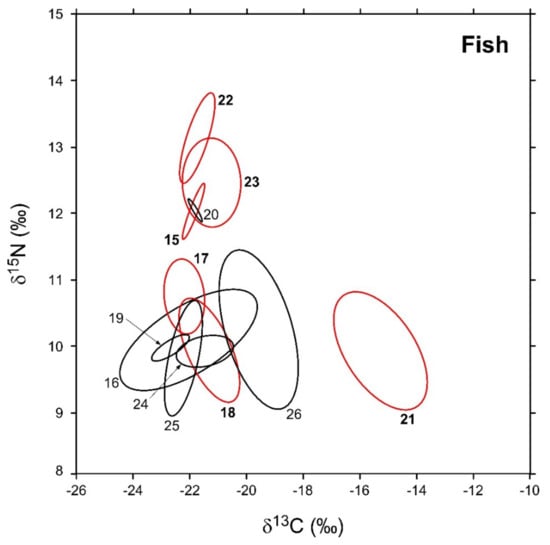 Sample-size-corrected Bayesian standard ellipse areas (SEAc) calculated from δ13C and δ15N values of fish consumers. Black and red ellipses refer to native and non-indigenous taxa, respectively; see Figure 2 for the corresponding identification codes.