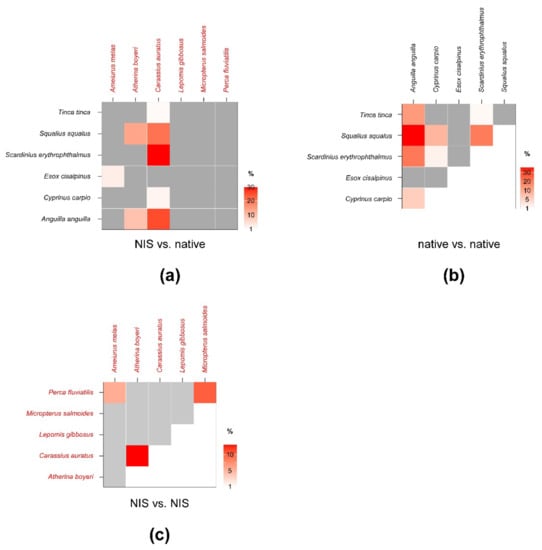 Percent isotopic niche overlaps of Bayesian standard ellipse areas (SEAB) of non-indigenous vs. native (a), native vs. native (b), and non-indigenous vs. non-indigenous fish consumers (c). Heat maps were built using modal overlaps; the reader should refer to Table A7, Table A8 and Table A9 in Appendix D for 95% confidence intervals of modal values and the corresponding SEAc estimations. Please note the different % scales.