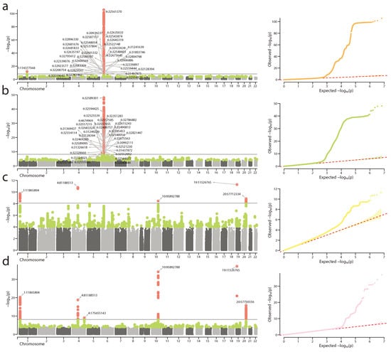 - Yin, L.; Zhang, H.; Tang, Z.; Xu, J.; Yin, D.; Zhang, Z.; Yuan, X.; Zhu, M.; Zhao, S.; Li, X.; et al. rMVP: A Memory-efficient, Visualization-enhanced, and Parallel-accelerated Tool for Genome-wide Association Study. Genom. Proteom. Bioinform. 2021, 19, 619–628. [Google Scholar] [CrossRef]