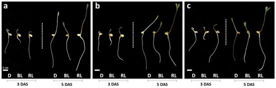 Effects of LED lights and darkness on the growth of lentil seedlings. Seedlings grown in darkness (D), blue LED light (BL), and red LED light (RL) at 3 and 5 days after sowing (DAS) with light intensities of 100 (a), 300 (b), and 500 (c) µmol m−2 s−1.
