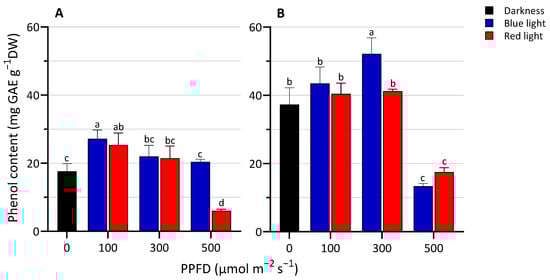 Total phenolic content at 3 (A) and 5 (B) days after sowing (DAS) of lentil seedlings grown in darkness and under blue or red LED at levels of PPFD of 100, 300, and 500 µmol m−2 s−1. The values are expressed as mean ± SD (n = 4). According to Tukey’s test, the same letters indicate non-significant differences among treatments (p ≤ 0.05).