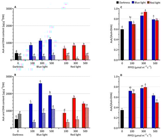 The ascorbate redox ratio (AsA/AsA + DHA) was higher under light treatments than in darkness (Figure 3C,D). Generally, no significant differences were observed between BL and RL according to the same light intensity.