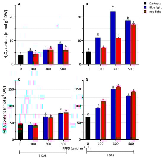 Levels of hydrogen peroxide (A,B) and lipid peroxidation (C,D) of lentil seedlings grown in darkness and under blue or red LED at levels of PPFD of 100, 300, and 500 µmol m−2 s−1 at 3 and 5 days after sowing (DAS). The values are expressed as mean ± SD (n = 4). According to Tukey’s test, the same letters indicate non-significant differences among treatments (p ≤ 0.05).