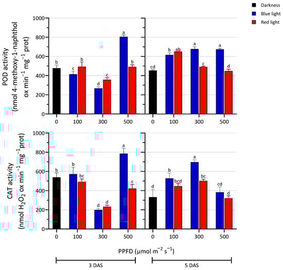 Enzyme activity of peroxidase (POD) and catalase (CAT) in seedlings treated with blue and red LED light at three PPFD levels (100, 300, and 500 µmol m−2 s−1) in the darkness, at 3 and 5 days after sowing (DAS). The values are expressed as mean ± SD (n = 4). According to Tukey’s test, the same letters indicate non-significant differences among treatments (p ≤ 0.05).