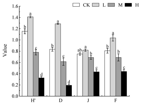 The variation trend of the local plant community diversity index under different degrees of Xanthium spinosum invasion. CK represents no invasion of X. spinosum; L represents low invasion of X. spinosum; M represents moderate invasion of X. spinosum; H represents heavy invasion of X. spinosum; H’ represents the Shannon–Wiener index; D represents Simpson’s index; J represents Pielou’s index; F represents Margalef’s index. Different lowercase letters indicate significant differences in species diversity indices under different levels of invasion by X. spinosum (mean ± SE, p < 0.05).