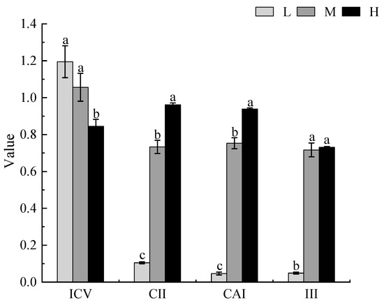 The changes in the stability, invasiveness, competitive advantage index, and invasion intensity index of the local plant community under different degrees of Xanthium spinosum invasion. L represents low invasion of X. spinosum; M represents moderate invasion of X. spinosum; H represents heavy invasion of X. spinosum; ICV represents the community stability index; CII represents the community invasiveness index; CAI represents the competitive advantage index of X. spinosum; III represents the invasion intensity index of X. spinosum. Different lowercase letters indicate significant differences under different degrees of invasion by X. spinosum (mean ± SE, p < 0.05).