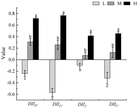 The influence of different degrees of Xanthium spinosum invasion on the diversity index of local plant communities. L represents low invasion of X. spinosum; M represents moderate invasion of X. spinosum; H represents heavy invasion of X. spinosum; DIIH’ represents the index of the degree of influence of X. spinosum on the Shannon−Wiener index; DIID’ represents the index of the degree of influence of X. spinosum on Simpson’s index; DIIJ’ represents the index of the degree of influence of X. spinosum on Pielou’s index; DIIF’ represents the index of the degree of influence of X. spinosum on the Margalef’s index. Different lowercase letters indicate significant differences under different degrees of invasion by X. spinosum (mean ± SE, p < 0.05).