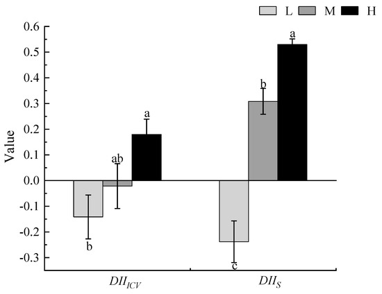 The influence of different degrees of Xanthium spinosum invasion on the species number and stability index of local plant communities. L represents low invasion of X. spinosum; M represents moderate invasion of X. spinosum; H represents heavy invasion of X. spinosum; DIIICV represents the degree index of the impact of X. spinosum on the community stability index; DIIS represents the index of the degree of influence of X. spinosum on the number of plant species in the community. Different lowercase letters indicate significant differences in the degree of invasion of X. spinosum (mean ± SE, p < 0.05).