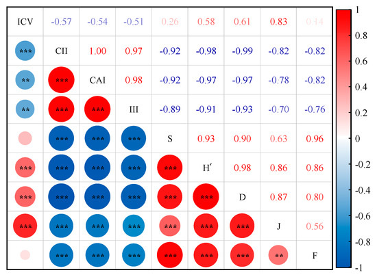 The correlation between the local plant community diversity index and community stability and invasibility. ICV is the community stability index; CII is the invasiveness index; CAI is the competitive advantage index of X. spinosum; III is the invasion intensity index of X. spinosum; S is the number of plant species in the community; H’ is the Shannon−Wiener index; D is Simpson’s index; J is Pielou’s index; F is Margalef’s index; **, p < 0.01; ***, p < 0.001.