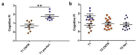 He1 treatment reverted cognitive frailty evaluated as the knowledge component of recognition memory during physiological ageing in mice. (a): Scatter plot of Cognitive FI Values measured at T1 in control (T1 CNTR, orange) and in pre-supplemented He1 mice (T1 pre-He1, blue). (b): Scatter plot of Cognitive FI Values measured at T1 in control and in pre-supplemented He1 animals (T1, orange and blue, respectively), and at T2 in control (T2 CNTR, orange) and in He1-supplemented mice (T2 He1, blue). P-value was calculated by unpaired Student’s t-test: p < 0.01 (**).