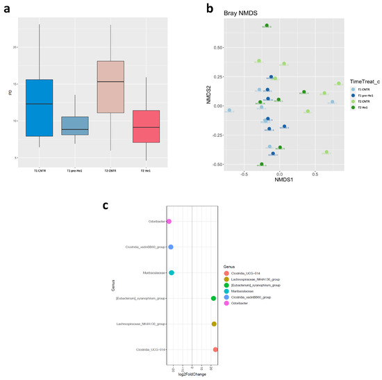 Gut microbiome composition. (a): Alpha-diversity distribution box plots estimated as Faith’s phylogenetic distance (PD) in control mice and He1-treated animals at T1 and T2 (T1 CNTR: blue; T1 pre-He1: light blue; T2 CNTR: pink; T2 He1: fuchsia). (b): Non-metric multidimensional scaling (NMDS). Colours in the bidimensional NMDS plot are used, as shown in the legend. The ordinate analysis is founded on the Bray–Curtis distance matrix. The graphical plot and the ellipses were generated by the ggplot2 R package implemented with the stat ellipse function. (c): Differential abundance (of selected genera that significantly changed) at T2 in He1 treated vs. control mice.