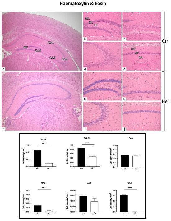 H&E staining revealing the well-preserved physiological hippocampal cytoarchitecture in non-supplemented controls (a–e) and He1-treated (f–j) elderly mice. (a,f): Low magnification micrograph shows the whole hippocampus, formed of Cornus Ammonis (CA; subdivided into CA1, CA2, CA3, and CA4) and dentate gyrus (DG). (b,g): Higher magnifications of the DG area displaying three distinct layers: ML, GL, and PL. (e,j): Higher magnifications of the CA1 region, showing the typical three-layered structure: outer polymorphic layer, i.e., Stratum oriens (SO); middle pyramidal cell layer, i.e., Stratum pyramidale (SP); inner molecular layer, i.e., Stratum radiatum (SR) in control and He1-supplemented animal, respectively. Light microscopy magnification: 4× (a,f); 20× (b–e,g–j). Histograms display the quantitative valuation of shrunken cell density in DG and CA subregions. p-values calculated by unpaired Student’s t-test. **** p < 0.0001.
