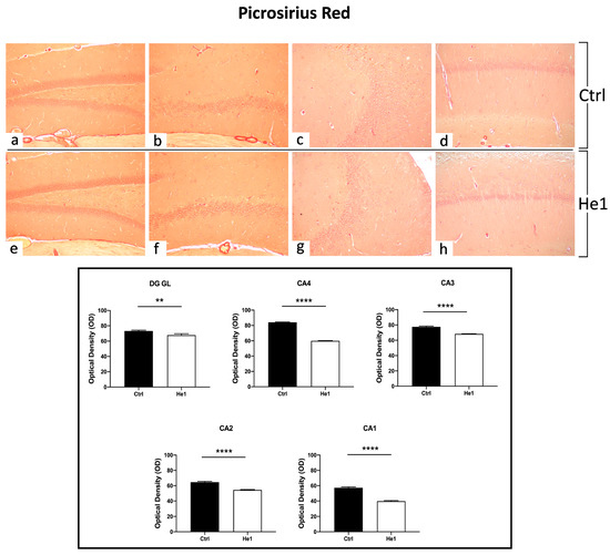 The Picrosirius Red staining method was used to evaluate collagen fibre organisation in paraffin-embedded tissues [47]. Both in controls and He1-treated mice, collagen fibres were mainly detected in collagen-rich vascular wall ECM, constituting the inner cellular lining of hippocampal blood vessels, showing a marked PSR staining. Notably, both in the DG as well as in the CA subfields, the quantitative investigation evidenced a significantly higher collagen fibre optical density (OD) in control mice vs. He1-treated animals (Figure 4, p < 0.01 and p < 0.0001 for DG and CA, respectively).