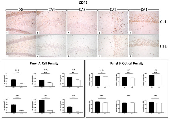 CD45 is a cellular marker highly expressed in microglia upon inflammation and ageing [48]. Both in controls and He1-treated mice, CD45 immunopositivity was detected in the DG and in four CA subfields, i.e., CA4, CA3, CA2, and CA1. Notably, the heaviest CD45 immunoreactivity was observed almost exclusively in control animals. In regard to the DG region, strongly CD45-immunopositive cells were clearly distinguished, primarily localised in the thickness of the GL. Several markedly CD45-immunoreactive granular cells located near the SGZ and in the PL were evidenced in control mice only. Interestingly, the same marked immunoreactivity was statistically significantly higher in controls compared to He1-treated mice in all CA regions. Specifically, several CD45-immunopositive cells were detected in the CA4 and CA2 regions of control animals, while immunoreactivity was completely lacking in He1-treated mice. In both experimental groups, the CA3 region exhibited pale immunolabeling (Figure 5). Accordingly, the quantitative analysis, comparing He1-treated mice with controls, documented an extremely significant reduction of CD45-immunoreactivity in the DG, measured in terms of both immunopositive cell density (Figure 5, GL: p < 0.0001 and PL: p < 0.01) and OD (Figure 5, GL: p < 0.01 and PL: p < 0.0001). Similarly, regarding all the CA subregions, a significant lessening of CD45-immunolabeling, assessed in terms of both CD45-immunopositive cell density and OD, was recorded comparing He1-treated mice with control animals (Figure 5, p < 0.0001).