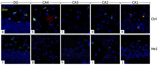 Double immunohistochemical detection of GFAP (green signal) and IL6 (red signal) by fluorescence microscopy in control animals (a–e) and He1-treated (f–j) mice. DNA counterstaining with Hoechst 33258 (blue fluorescence). Magnification: 60× (a–j).