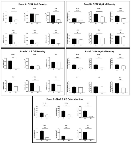 Panel A: Histograms illustrating GFAP-immunopositive cell density determined in DG and CA subregions of control and He1-supplemented mice. p-values determined by unpaired Student’s t-test. **** p < 0.0001. Panel B: Histograms indicating GFAP-immunopositive cell OD measured in DG and CA subregions of control and He1-supplemented mice. p-values calculated by unpaired Student’s t-test. * p < 0.05; ** p<0.01; **** p < 0.0001. Panel C: Histograms illustrating IL6-immunopositive cell density determined in DG and CA subregions of control and He1-supplemented mice. p-values calculated by unpaired Student’s t-test. * p < 0.05; **** p < 0.0001. Panel D: Histograms illustrating IL6-immunopositive cell OD determined in DG and CA subregions of control and He1-supplemented mice. p-values calculated by unpaired Student’s t-test. **** p < 0.0001. Panel E: Histograms showing the GFAP- and IL6- double-immunopositive cell density, determined in DG and CA subregions of control and He1-supplemented mice. p-values calculated by unpaired Student’s t-test. *** p < 0.001; **** p < 0.0001.