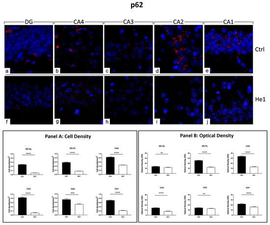 Immunocytochemical detection of p62 (red signal) by fluorescence microscopy in control animals (a–e) and He1-treated (f–j) mice. DNA counterstaining with Hoechst 33258 (blue fluorescence). Magnification: 60× (a–j). Panel A: Histograms displaying p62-immunopositive cell density measured in DG and CA subregions of control and He1-supplemented mice. p-values calculated by unpaired Student’s t-test. *** p < 0.001; **** p < 0.0001. Panel B: Histograms presenting p62-immunopositive cell OD determined in DG and CA subregions of control and He1-supplemented mice. p-values calculated by unpaired Student’s t-test. ** p < 0.01; **** p < 0.0001.