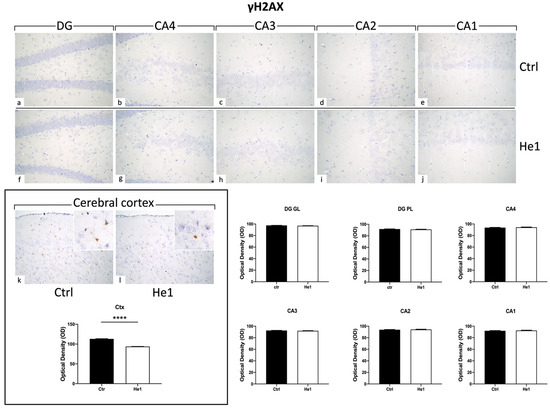 Histone 2AX (H2AX) is among the initial molecules engaged in the response to DNA damage. Following exposure to agents that damage DNA, H2AX undergoes fast phosphorylation/activation, resulting in γH2AX, which is crucial for preventing genomic instability [51]. Our results showed the absence of γH2AX expression in the DG and CA areas (both for immunopositive cell density and OD) of control and He1-treated mice (Figure 9). Particularly, on the contrary, observing the cerebral cortex as a reference CNS area known to express γH2AX, an evident immunoreactivity was noticeable, with the following quantitative examination corroborating a significant increase of γH2AX-immunolabeling OD in He1-supplemented mice vs. controls (Figure 9, p < 0.0001)