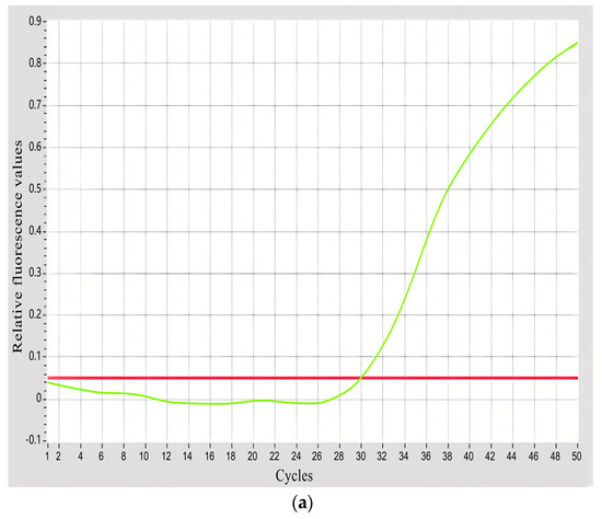 The amplification curve of A. sinensis specific primers. (a) Positive amplification. (b) Negative amplification. The red line represents the threshold line, while the green line depicts the amplification curve of the mixed sample. The CT value is determined via the intersection of these two lines.