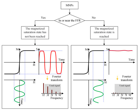 Basic principles of MPI imaging. (left) The response signal of the MNPs in the unsaturated state. (right) Saturation state of MNPs signal.