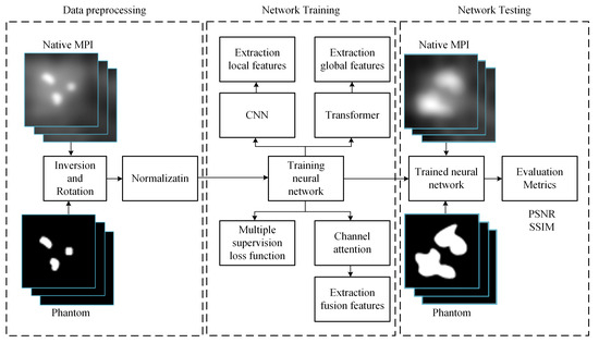 The workflow of this study, illustrated in Figure 3, unfolds in three main phases: data preprocessing, network training, and MPI image deblurring. In the data preprocessing phase, the dataset undergoes augmentation operations, including inversion and rotation, to enrich its diversity. Subsequently, this augmented dataset is subjected to normalization for consistency. Once the training data is prepared, it is fed into our model to initiate the training process, adjusting model parameters for optimization. Upon completion of training, the trained model can be employed to input MPI images afflicted with artifacts, thereby generating predictions of artifact-free, clear images.