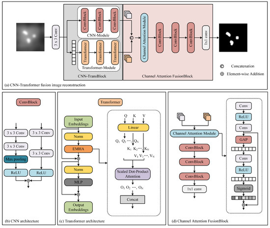The network architecture is shown in Figure 4. Our proposed architecture leverages the inherent physical attributes of MPI imaging, presenting a cascaded CNN-Transformer deep learning network model. The proposed network comprises three main components: a dual-branch convolution module, a transformer module, and a feature fusion module. The dual-branch convolution module is designed to capture local features in MPI images. It consists of two parallel CNNs. One network extracts relevant information, while the other focuses on removing unwanted artifacts, effectively addressing image blurriness issues in MPI images. The transformer module is designed to extract global features and mitigating overall image non-uniformity. It contains convolutional projection, EMHA, and MLP components. The convolutional projection module utilizes depth-wise separable convolution (DWSC) to extract query, key, and value components for each marker. These projections are then processed by the EMHA module, followed by the extraction of global features using the MLP. This module primarily focuses on alleviating global image non-uniformity. The feature fusion module predominantly consists of convolutional layers and effectively integrates local and global features using attention mechanisms.