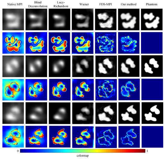 To validate the efficacy of our proposed approach, we conducted a series of experiments using diverse datasets and compared our method with conventional techniques such as blind deconvolution, Lucy deconvolution, and Wiener filtering. In addition, we also contrasted our method with the learning-based approach (FDS-MPI [30]). We conducted validation on the simulation dataset, selecting three different tumor shapes, each containing simulated instances of two tumors. As depicted in Figure 5, the first, third, and fifth rows illustrate the reconstruction outcomes for various simulation data, while the second, fourth, and sixth rows represent the corresponding error maps. The findings revealed that, irrespective of the tumor’s shape, our method adeptly restored the precise boundary contours of the simulation data. This capability holds critical significance for accurate tumor localization. Additionally, we quantified the results, and the quantitative outcomes are presented in Table 2. The PSNR of traditional methods did not exceed 20, and the SSIM did not exceed 0.5. Our method achieved a PSNR of 27.9796 and an SSIM of 0.8062.