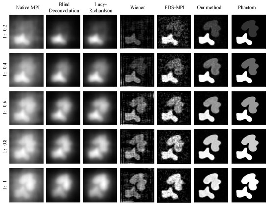 During MPI imaging, the accurate quantification of low-concentration targets is often challenging when multiple targets with varying concentrations are present in the field of view. In our study, we simulated five concentration ratios: 1:0.2, 1:0.4, 1:0.6, 1:0.8, and 1:1. Each ratio was applied to two tumor targets, and MPI imaging was performed. The resulting images were analyzed using conventional methods such as Blind deconvolution, LucyRichardson, and Winear algorithms, as well as our proposed deep learning algorithm. In Figure 6, the first column of the figure displays the original MPI images, while the second to fourth columns present the results obtained from the aforementioned conventional methods. The fifth column showcases the outcomes of our proposed approach, while the sixth column presents the ground truth concentration distribution. Notably, the traditional methods struggled to accurately reconstruct the target with concentration differences, particularly the Blind and Lucy methods. Conversely, our deep learning algorithm demonstrated superior performance in restoring the original concentrations of both targets, thereby may help facilitate precise tumor localization. To further evaluate the performance of the different methods, we conducted a quantitative analysis. The result of Table 3 demonstrates the substantial improvements achieved by our proposed method across two metrics: PSNR and SSIM. Moreover, irrespective of the concentration ratio, our method consistently outperformed the other techniques, particularly in cases with no concentration difference between the two targets.