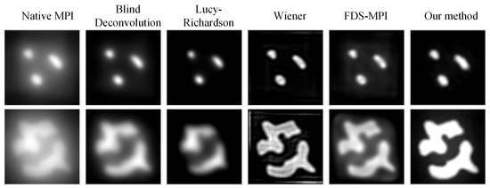 In MPI, two primary reconstruction methods exist: X-space [12,13] and system matrix (SM) reconstruction [14]. Both methods are employed to reconstruct images of the spatial distribution of magnetic particles within a target area from collected magnetic signal data. The key to system matrix-based reconstruction in MPI lies in constructing the system matrix. The SM describes the mapping between spatial concentration distribution and induced voltage signals, composed of the Fourier components of time signals produced by each magnetic nanoparticle at all possible spatial positions. The SM is constructed through measurements of MNPs’ spatial movement along specific trajectories or through mathematical modeling. However, the construction of the SM is time-consuming and memory-intensive [15]. On the other hand, the X-space method separates image reconstruction from convolution, allowing for modular imaging and faster reconstruction [16]. Nevertheless, X-space reconstruction introduces artifacts that can impact the localization accuracy of MNPs. Previous research has often employed traditional deconvolution methods to mitigate these artifacts, but deconvolution can amplify noise and introduce additional image artifacts [17,18].