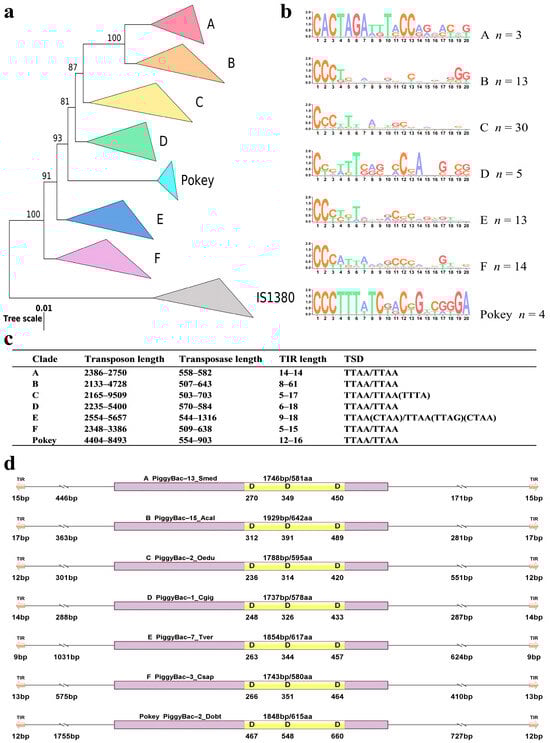 Figure 1. Classification and structural organization of piggyBac (PB). (a) Phylogenetic tree of PB elements in animals identified in our study, together with 82 reference sequences. The sequences of IS1380 were used as the outgroup. Red, Orange, Yellow, Green, Cyan, Blue, Purple and Grey, respectively, stand for seven types of PB transposons (A–F and Pokey). The complete evolutionary tree is as shown in Figure S2. (b) The alignment logo for PB elements. The TBtools (v1.0987663) (https://github.com/CJ-Chen/TBtools/releases, accessed on 12 September 2023) was used to create the logo representation of the first 20 bp of the TIR 5′ sequences. (c) Information for each clade. (d) Structure organization summary table of families. The orange arrows represent TIR, yellow column represents DDD domains, and purple column represents transposons.