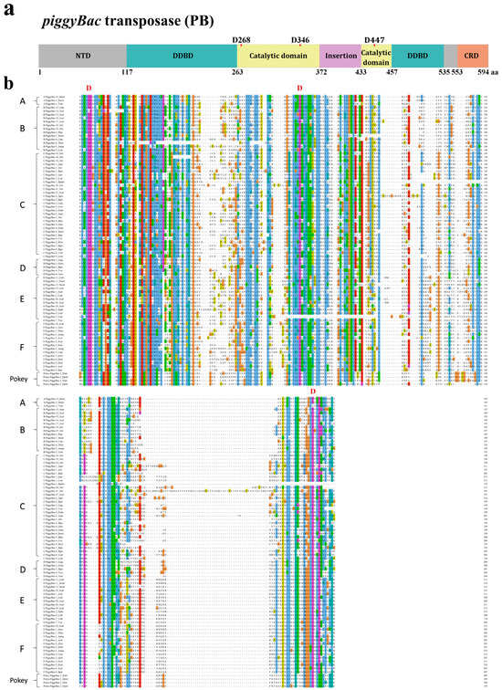Figure 2. Sequence analysis. (a) PB transposases. (b) Multiple sequence alignments were performed on the DDD domains of complete PB transposases classified into seven. Multiple sequence alignments of other domains are in Supplementary Figure S3.