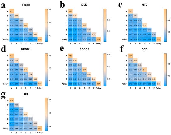 Figure 3. Sequence identities between A–Pokey clades. The numbers in the heatmap represent the percentage of the average sequence identities between the two clades of transposons. The average sequence identities were calculated by pairwise comparing of the sequences of Tpase (transposase) (a), DDD (Catalytic domain) (b), NTD (N-terminal domain) (c), DDBD1 (Dimerization and DNA-binding domain one) (d), DDBD2 (Dimerization and DNA-binding domain two) (e), CRD(C-terminal cysteine-rich domain ) (f) and TIR (Terminal inverted repeat) (g) from complete PB transposases with a length of at least 500 amino acids.