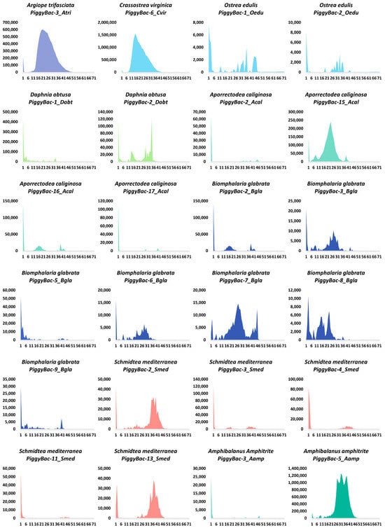 Figure 4. K divergences of evolutionary dynamics in compact genomes of animals. The y-axis represents the coverage (%) of each PB transposon in the genome, while the x-axis indicates the K divergence estimate (%). The names of the species are displayed at the top of each chart.