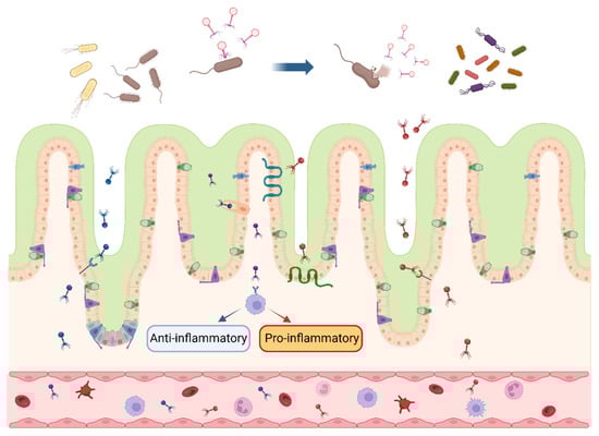 Interactions between bacteriophages and intestinal bacteria and cells. After multiplying and expanding within the intestinal host bacteria, bacteriophages secrete lytic enzymes to lyse the cell wall and release bacteriophage progeny, which continue to inhabit the host bacterial population. Bacteriophages enter the intestinal wall in response to specific receptors and cytophagy in intestinal epithelial cells and cross into the blood circulation, inducing anti-inflammatory (blue arrow) or pro-inflammatory (red arrow) response. The blue arrow at the top of the picture indicates that the bacteriophages infest and lyse the bacteria in the intestinal lumen. Different colors represent various species of bacteriophages and their progeny. (figure created using BioRender, https://biorender.com. accessed on 27 November 2023).