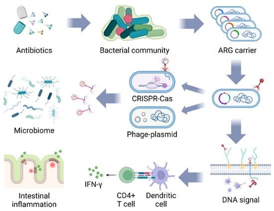 The potential threat of bacteriophage-mediated ARG diffusion and induction of IFN-γ synthesis. The bacterial population mutates to generate ARGs under the stimulation of antibiotics, and bacteriophages carrying ARGs bred from the previous host continue to infect the next group of bacteria, which is endowed with ARGs by means of bacterial CRISPR-Cas shearing and gene integration of bacteriophage plasmids, and repeated cycles lead to more microbial populations carrying ARGs. Bacteriophage DNA enters the bacteria and is recognized by TLR9, which stimulates dendritic cells to deliver antigen to CD4+ T cells, inducing them to synthesize IFN-γ to aggravate the intestinal inflammatory response (figure created in BioRender, https://biorender.com. accessed on 12 December 2023).