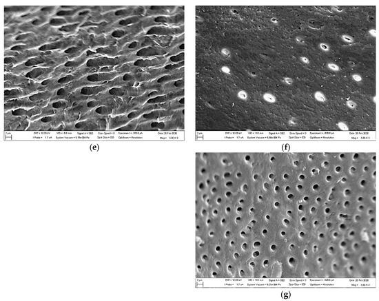 SEM images in Figure 2a–g obtained at the same magnification (×5000) illustrate changes in the progressively demineralized surfaces of individual HTT scaffolds (grains) as a function of the solution used and exposure time. Demineralization treatment of HTT exposed ADDM and its organic components. The least exposed surface corresponds to the reference (Natural) sample (Figure 2a). In Figure 2b–f, the gradually decreasing detrital deposits and the progressive demineralization of the surface can be seen. Figure 2b,c shows only the absence of detritus. Figure 2d–f shows gradual exposure of organic matrix with visible dentin tubules after application of demineralization solutions. The most exposed surface was obtained in the sample treated with 0.6 N HCl for 5 min (Figure 2g). Its surface was clean, no detritus was present, wide open tubular holes were visible after treatment, and the organic matrix was completely exposed.