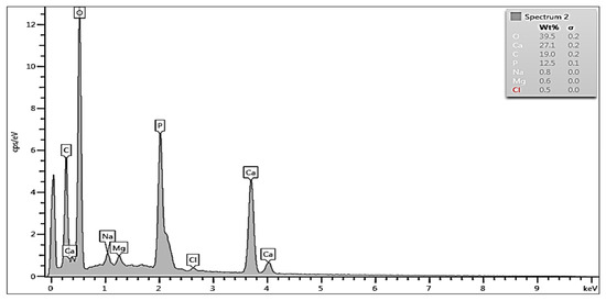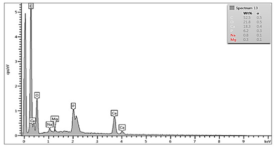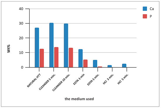 The treatment by EDTA for 3 min and 5 min (see Figure 4 and Figure 5, respectively) reduced the concentrations of Ca to 18 wt% and 5 wt% and P concentrations to 6 wt% and <1 wt%, respectively. The demineralization was even stronger after the application of HCl (Figure 5). The application of Cleanser resulted in slight increases in Ca and P concentrations, most probably due to the elimination of detritus (see later comparison in Figure 6). The Ca concentration after 5 min was only 2.5 wt% and P was completely eliminated. The process of demineralization and the exposure of the organic matrix was simultaneously accompanied by increases in C and O concentrations, which enhanced its osteoinductive and osteogenetic activities.