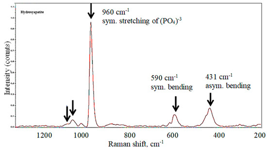 Reference Raman spectrum of (PO4)−3 group in the hydroxyapatite and tricalcium phosphate [22,23].