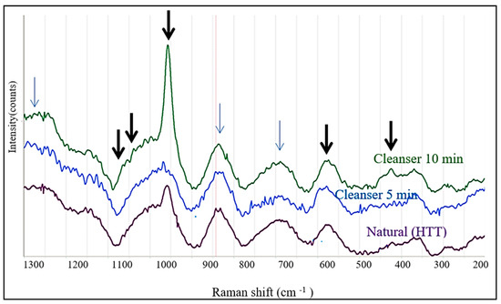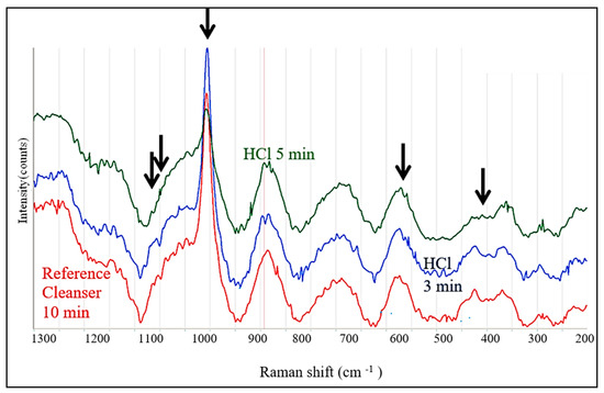 Figure 8 compares the Raman spectra from the natural HTT and after its treatment by Cleanser for 5 and 10 min, respectively. Despite lower intensities, the spectra contained all peaks corresponding to the (PO4)−3 groups in Figure 7 and some additional peaks around 890 cm−1 and 780 cm−1, and wide band above 1250 cm−1. The increase in the intensities of the (PO4)−3 peaks (at 960, 590 and 430 cm−1) after the application of Cleanser for 5 min indicates that it was exposed by this treatment. This spectrum was subsequently used as a reference to reveal the effects of treatment in EDTA and HCl.